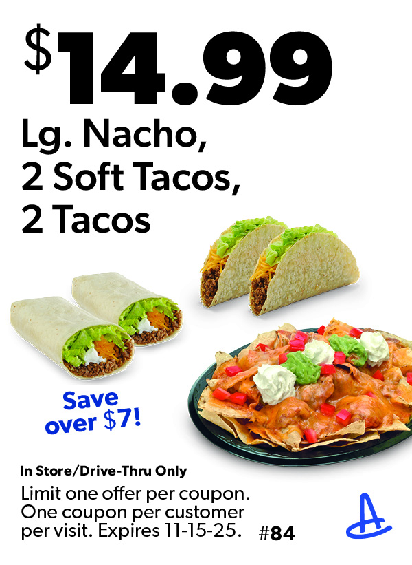 $14.99 Large Nachos, 2 Soft Tacos and 2 Tacos