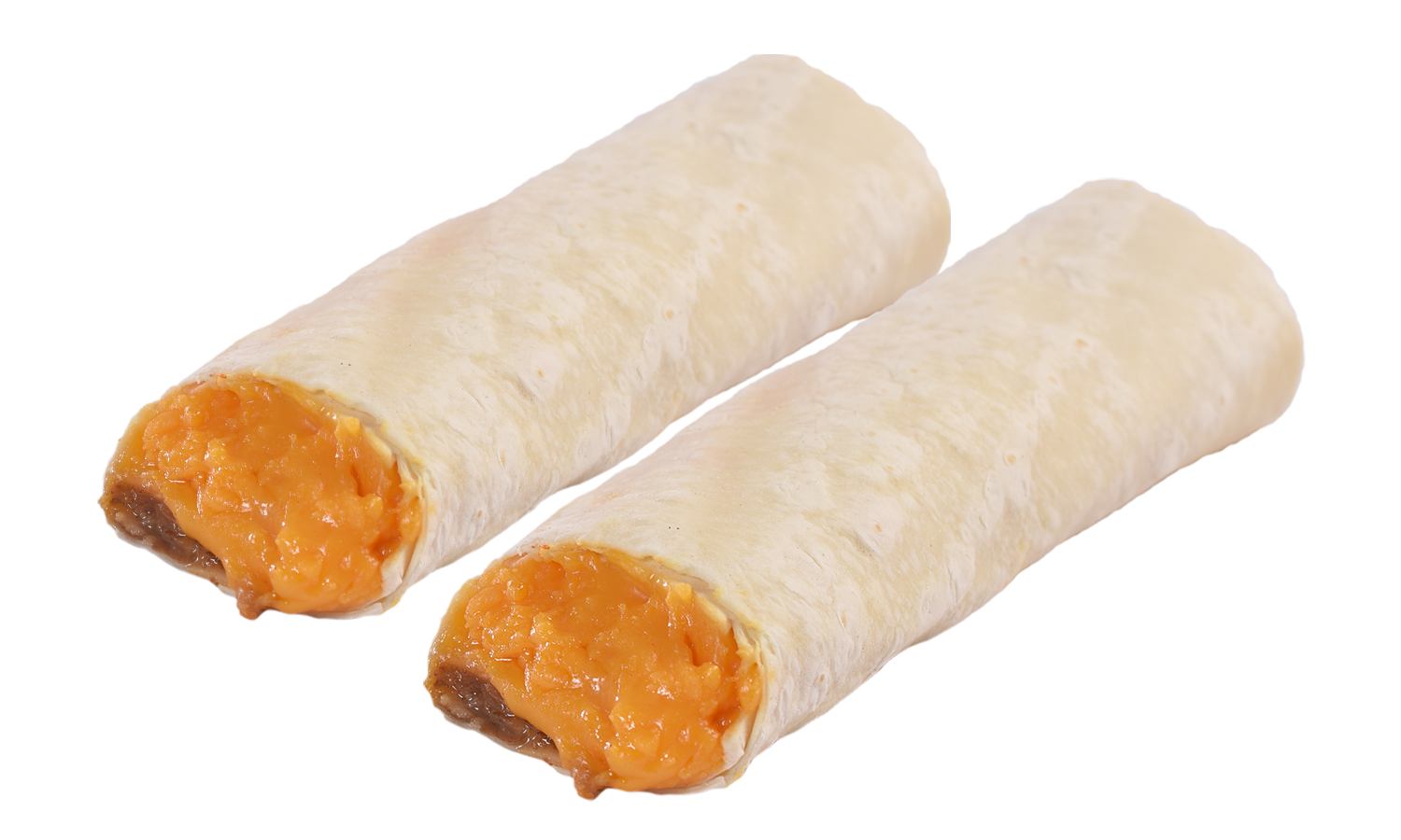 Lots of melted cheddar cheese and a thin layer of refritos rolled in a flour tortilla.