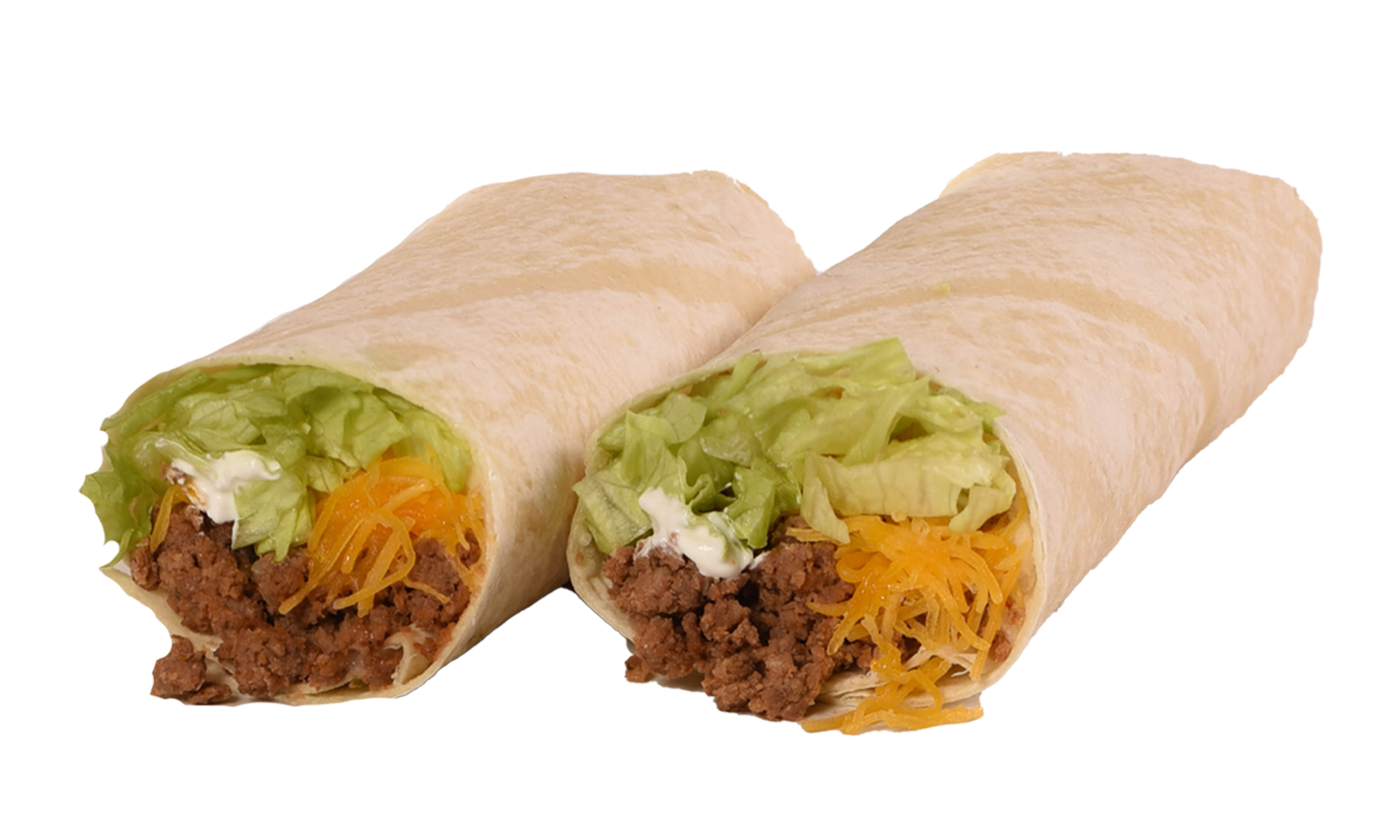 Our #1 seller! Ground beef, cheddar cheese, lettuce, and sour cream rolled in a soft flour tortilla.