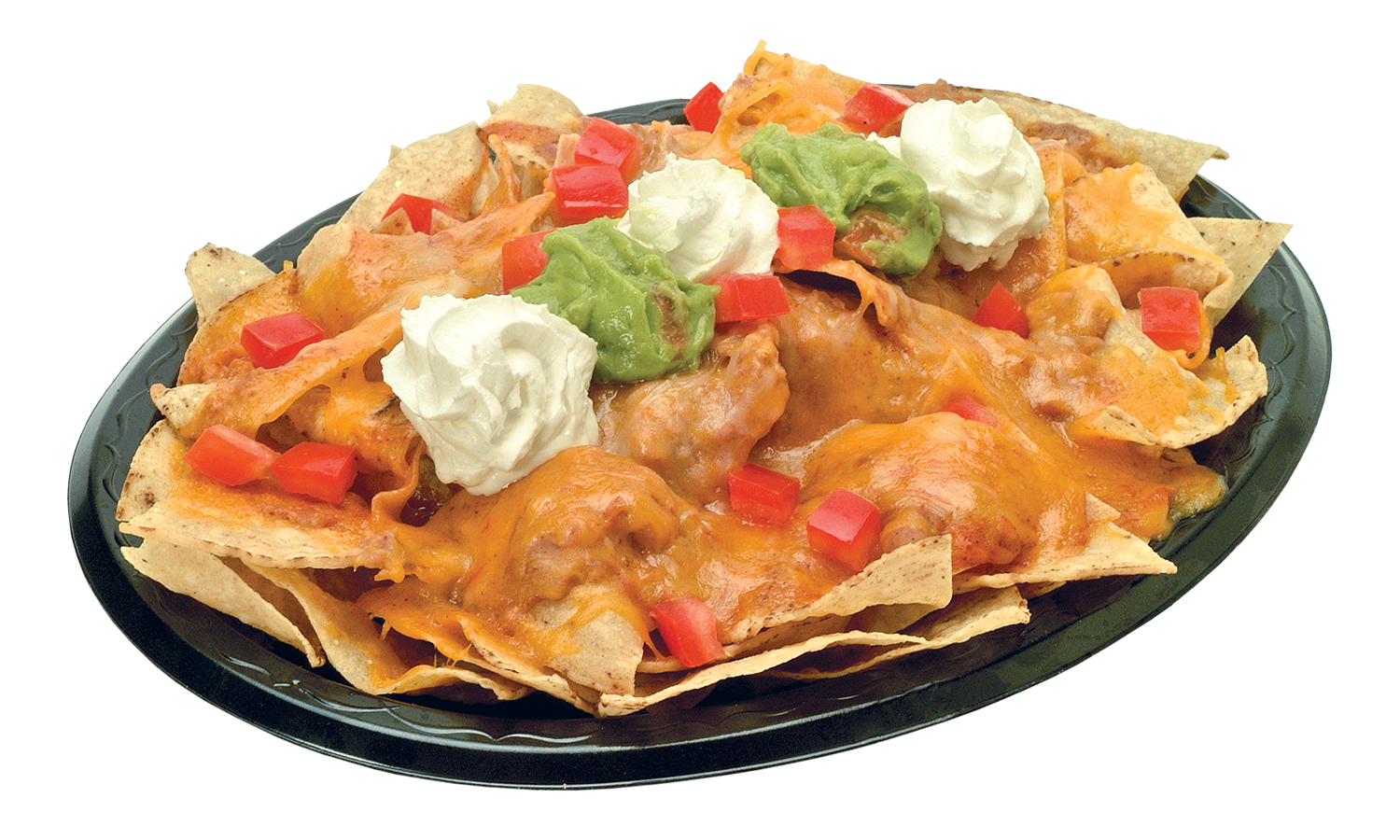 Fresh tortilla chips topped with refritos, enchilada sauce, cheddar and Monterey Jack cheese, tomatoes, guacamole and sour cream.